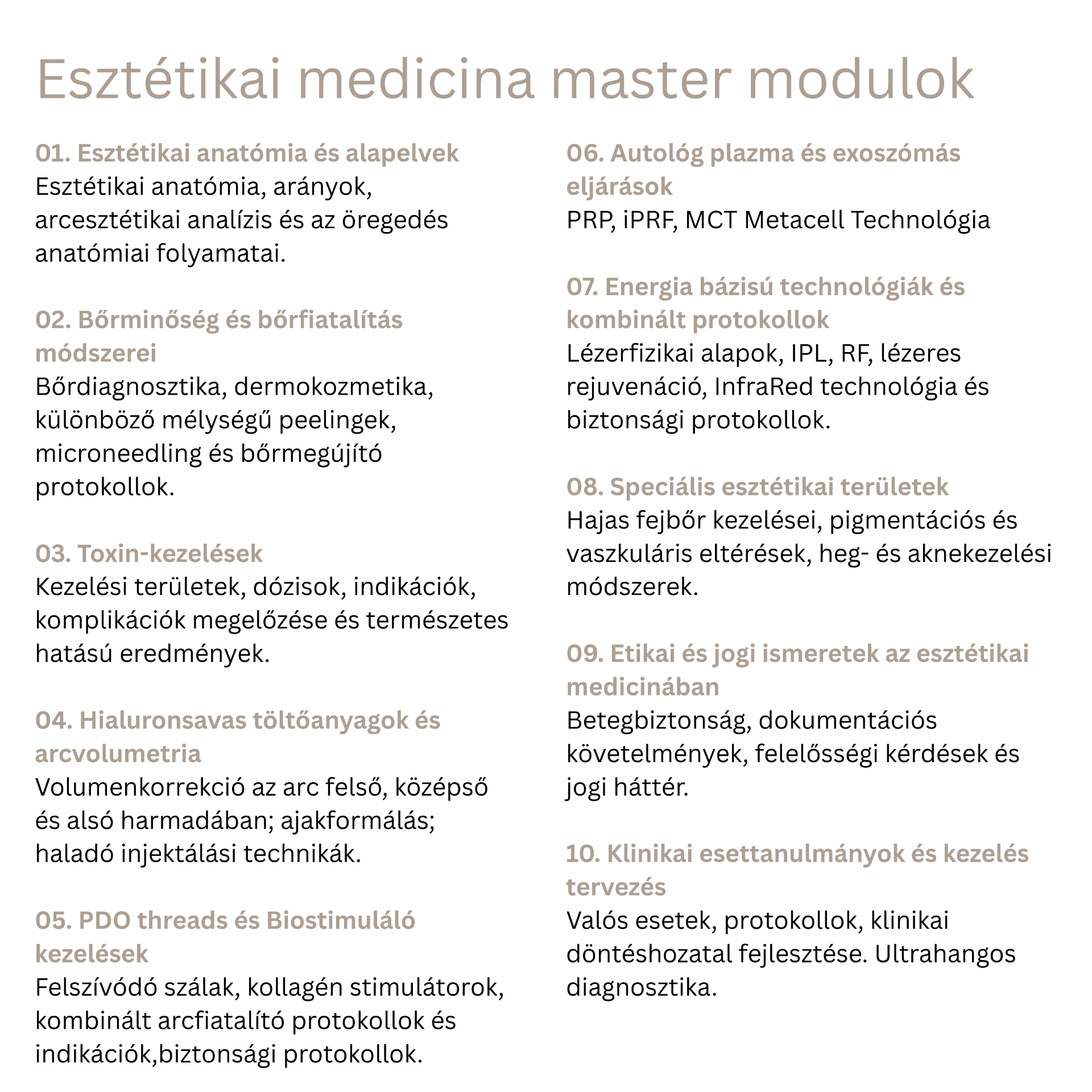 A master képzések magas szintű, nemzetközi egyetemi kollaborációval megvalósuló továbbképzések, amelyek az esztétikai medicina kezelések teljes spektrumát ölelik fel, és céljuk az orvosok elméleti tudásának elmélyítése, valamint gyakorlati kompetenciáinak fejlesztése az esztétikai medicina területén. A programok hangsúlyt fektetnek az anatómiai, élettani és klinikai alapokra, a bizonyítékokon alapuló kezelési protokollokra, valamint a modern esztétikai eljárások és technológiák biztonságos alkalmazására.