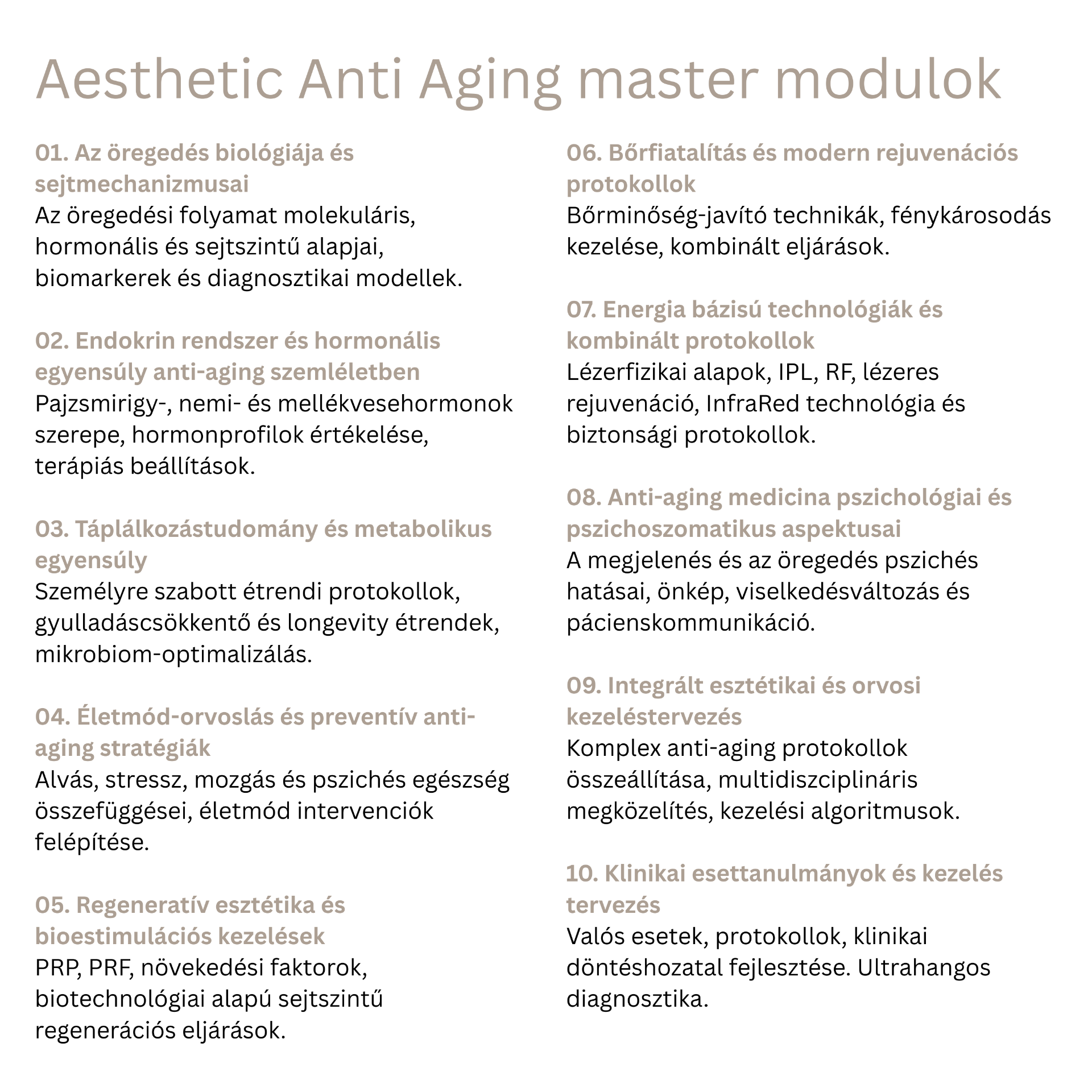 sejtszintű öregedési folyamatok, hormonális egyensúly és endokrin moduláció, regeneratív medicina és biostimuláció, bőrfiatalítás és modern rejuvenációs eljárások, táplálkozástudomány és életmód-orvoslás, pszichológiai és metabolikus aspektusok, esztétikai anti-aging technikák kombinált alkalmazása