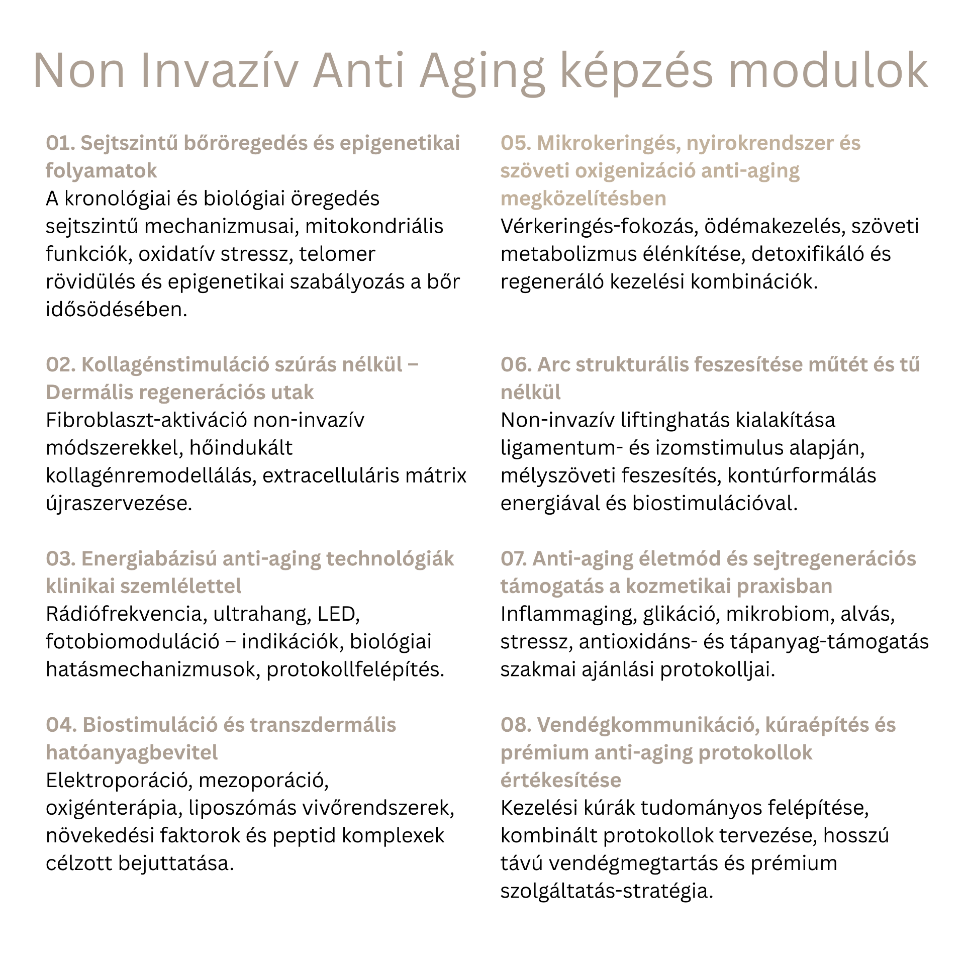A képzés célja, hogy a résztvevők magabiztosan alkalmazható, kombinálható, biztonságos anti-aging protokollokat sajátítsanak el, amelyek azonnal beépíthetők a kezelési palettába – műtéti vagy injekciós beavatkozások nélkül.